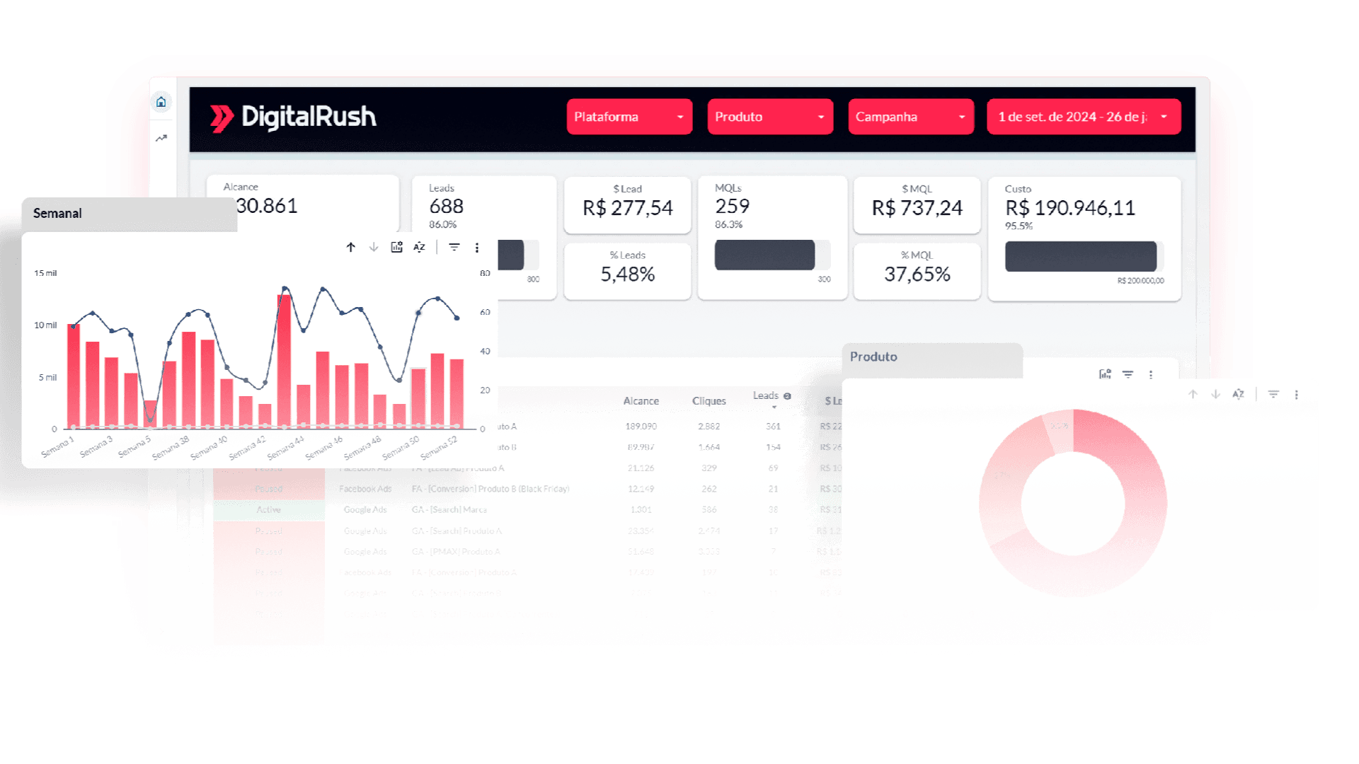 Leitura clara do que performa e do que drena orçamento por canal, campanha e variações.